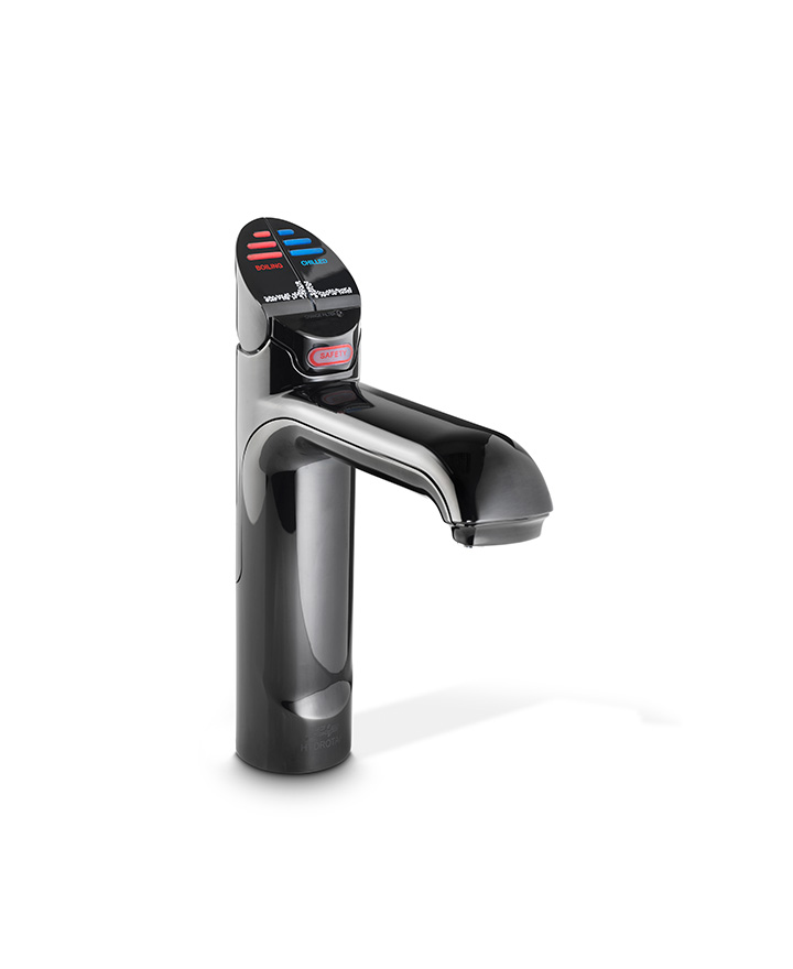 Zenith HydroTap Boiling, Chilled, Sparkling, Filtered water appliance featuring a single under bench command centre including full colour interactive touch screen display with pin code protection, 2 boiling water safety modes, 3 energy saving modes including sensor activated "sleep when its dark", 0.2 micron water filtration and a refillable CO2 cylinder.