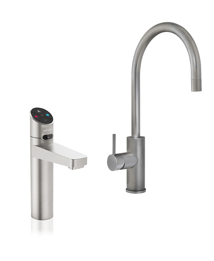 Zenith HydroTap Design Range 5 in 1 Boiling, Chilled, Sparkling, Filtered water plus Hot and Cold washing up water from two separate taps. This water system features a single under bench command centre including full colour interactive touch screen display with pin code protection and customisable settings including boiling water safety mode, 2 energy saving modes including ON/OFF timers and 2 hour sleep mode, 'Quiet' mode with automated intelligent fan speed adjustment, antimicrobial protection impregnated into key water paths for enhanced hygiene, 100% water efficient air cooled technology, 0.2 micron water filtration, and a refillable CO2 cylinder. Easy to install integrated ventilation tray included.