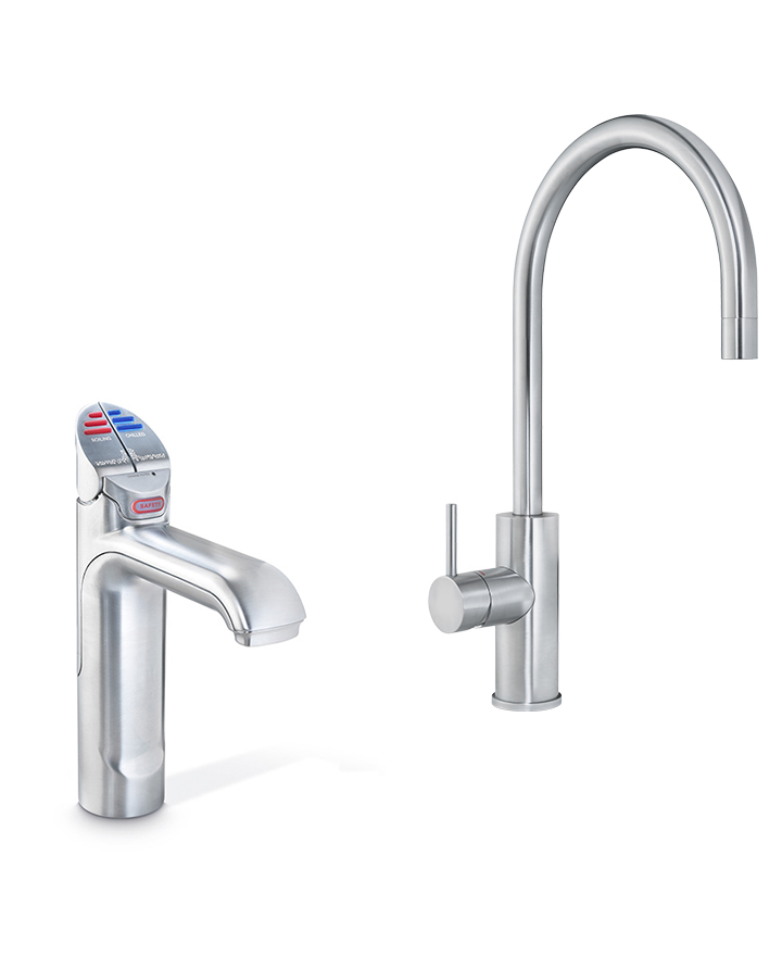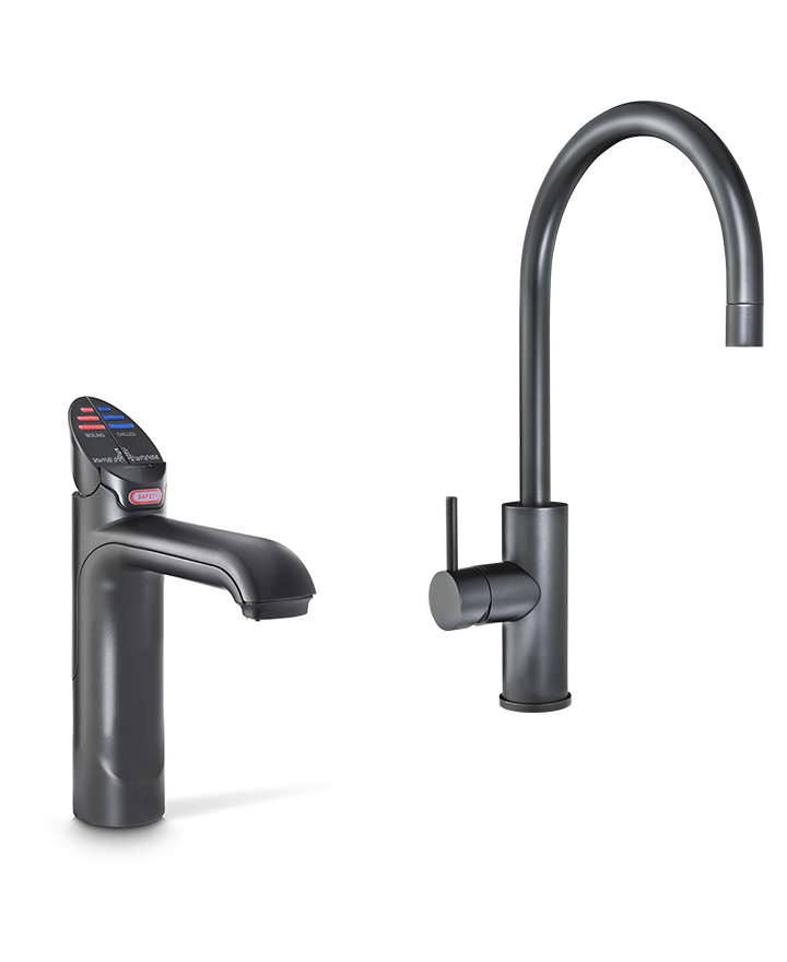 Zenith HydroTap Classic 5 in 1 Boiling, Chilled, Sparkling, Filtered water plus Hot and Cold washing up water from two separate taps. The system features a single under bench command centre including full colour interactive touch screen display with pin code protection and customisable settings including 2 boiling water safety modes, 3 energy saving modes including ON/OFF timers and sensor activated 'sleep when it's dark', 'Quiet' mode with automated intelligent fan speed adjustment, antimicrobial protection impregnated into key water paths for enhanced hygiene, 100% water efficient air cooled technology, and 0.2 micron water filtration. Easy to install integrated ventilation tray included.