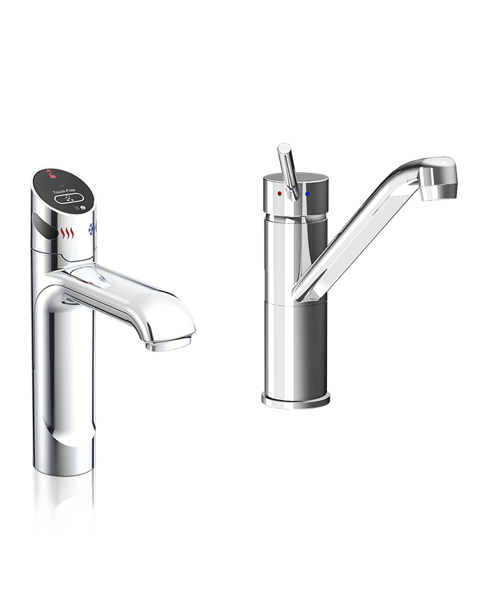 Zenith HydroTap Touch-Free Wave 5 in 1 Boiling, Chilled, Sparkling, Filtered water plus Hot and Cold washing up water from two separate taps. The system uses smart infrared 100% touch-free operation that is activated with the Wave of a hand. The water system features a single under bench command centre including full colour interactive touch screen display with pin code protection and customisable settings including boiling water safety mode, 2 energy saving modes including ON/OFF timers and 2 hour sleep mode, 'Quiet' mode with automated intelligent fan speed adjustment, antimicrobial protection impregnated into key water paths for enhanced hygiene, 100% water efficient air cooled technology, 0.2 micron water filtration, and a refillable CO2 cylinder. Easy to install integrated ventilation tray included.