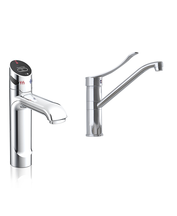 Zenith HydroTap Touch-Free Wave 5 in 1 Boiling, Chilled, Sparkling, Filtered water plus Hot and Cold washing up water from two separate taps. The system uses smart infrared 100% touch-free operation that is activated with the Wave of a hand. The water system features a single under bench command centre including full colour interactive touch screen display with pin code protection and customisable settings including boiling water safety mode, 2 energy saving modes including ON/OFF timers and 2 hour sleep mode, 'Quiet' mode with automated intelligent fan speed adjustment, antimicrobial protection impregnated into key water paths for enhanced hygiene, 100% water efficient air cooled technology, 0.2 micron water filtration, and a refillable CO2 cylinder. Easy to install integrated ventilation tray included.