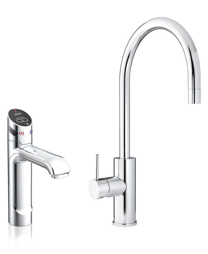 Zenith HydroTap Touch-Free Wave 5 in 1 Boiling, Chilled, Sparkling, Filtered water plus Hot and Cold washing up water from two separate taps. The system uses smart infrared 100% touch-free operation that is activated with the Wave of a hand. The water system features a single under bench command centre including full colour interactive touch screen display with pin code protection and customisable settings including boiling water safety mode, 2 energy saving modes including ON/OFF timers and 2 hour sleep mode, 'Quiet' mode with automated intelligent fan speed adjustment, antimicrobial protection impregnated into key water paths for enhanced hygiene, 100% water efficient air cooled technology, 0.2 micron water filtration, and a refillable CO2 cylinder. Easy to install integrated ventilation tray included.