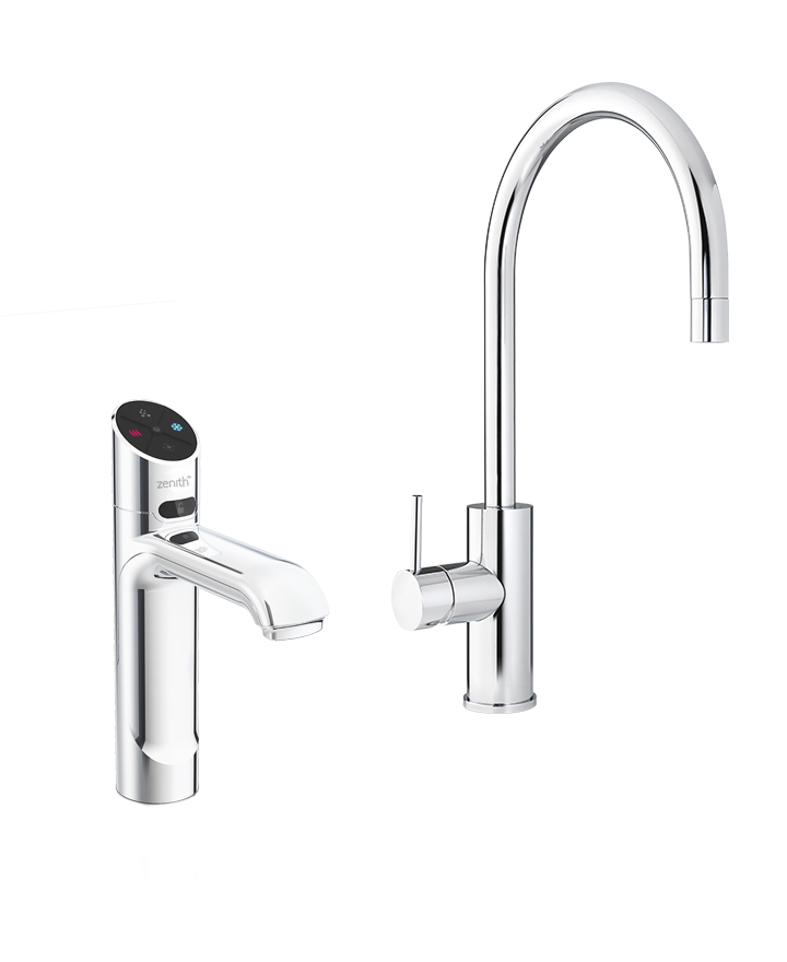 Zenith HydroTap Classic Plus 4 in 1 Boiling, Chilled, Filtered water plus Hot and Cold washing up water from two separate taps. The system features a single under bench command centre including full colour interactive touch screen display with pin code protection and customisable settings including 2 boiling water safety modes, 3 energy saving modes including ON/OFF timers and sensor activated 'sleep when it's dark', 'Quiet' mode with automated intelligent fan speed adjustment, antimicrobial protection impregnated into key water paths for enhanced hygiene, 100% water efficient air cooled technology, and 0.2 micron water filtration. Easy to install integrated ventilation tray included.