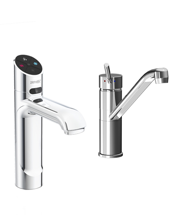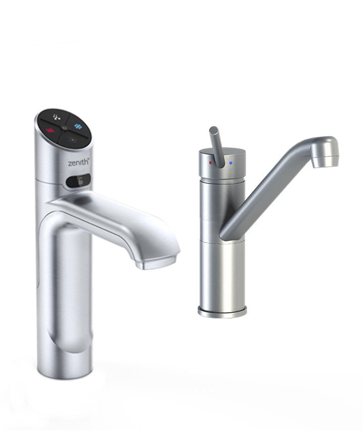 Zenith HydroTap Classic Plus 5 in 1 Boiling, Chilled, Sparkling, Filtered water plus Hot and Cold washing up water from two separate taps. The system features a single under bench command centre including full colour interactive touch screen display with pin code protection and customisable settings including 2 boiling water safety modes, 3 energy saving modes including ON/OFF timers and sensor activated 'sleep when it's dark', 'Quiet' mode with automated intelligent fan speed adjustment, antimicrobial protection impregnated into key water paths for enhanced hygiene, 100% water efficient air cooled technology, and 0.2 micron water filtration. Easy to install integrated ventilation tray included.