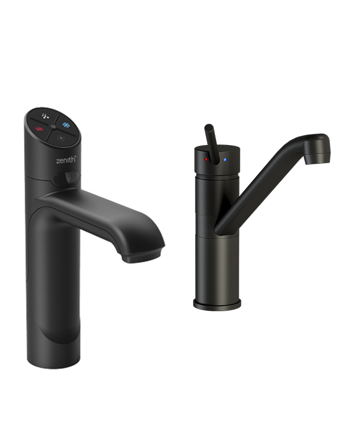 Zenith HydroTap Classic Plus 5 in 1 Boiling, Chilled, Sparkling, Filtered water plus Hot and Cold washing up water from two separate taps. The system features a single under bench command centre including full colour interactive touch screen display with pin code protection and customisable settings including 2 boiling water safety modes, 3 energy saving modes including ON/OFF timers and sensor activated 'sleep when it's dark', 'Quiet' mode with automated intelligent fan speed adjustment, antimicrobial protection impregnated into key water paths for enhanced hygiene, 100% water efficient air cooled technology, and 0.2 micron water filtration. Easy to install integrated ventilation tray included.