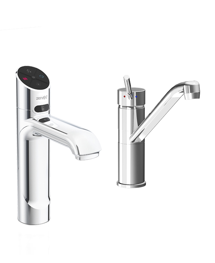Zenith HydroTap Classic Plus 3 in 1 Boiling Filtered water plus Hot and Cold washing up water from two separate taps. The system features a single under bench command centre including full colour interactive touch screen display with pin code protection and customisable settings including 2 boiling water safety modes, 3 energy saving modes including ON/OFF timers and sensor activated 'sleep when it's dark', 'Quiet' mode with automated intelligent fan speed adjustment, antimicrobial protection impregnated into key water paths for enhanced hygiene, 100% water efficient air cooled technology, and 0.2 micron water filtration.