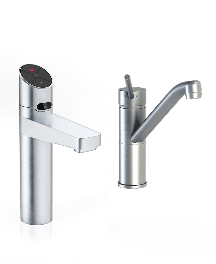 Zenith HydroTap Design Range 3 in 1 Boiling Filtered water plus Hot and Cold washing up water from two separate taps. This water system features a single under bench command centre including full colour interactive touch screen display with pin code protection and customisable settings including boiling water safety mode, 2 energy saving modes including ON/OFF timers and 2 hour sleep mode, 'Quiet' mode with automated intelligent fan speed adjustment, antimicrobial protection impregnated into key water paths for enhanced hygiene, 100% water efficient air cooled technology, 0.2 micron water filtration, and 2 disposable CO2 cylinders.