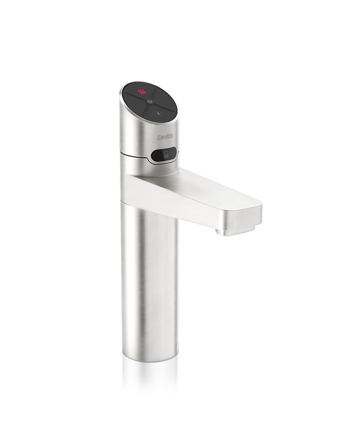 Zenith HydroTap Design Range Boiling, Filtered water system features a single under bench command centre including full colour interactive touch screen display with pin code protection and customisable settings including boiling water safety mode, 2 energy saving modes including ON/OFF timers and 2 hour sleep mode, antimicrobial protection impregnated into key water paths for enhanced hygiene, and 0.2 micron water filtration.