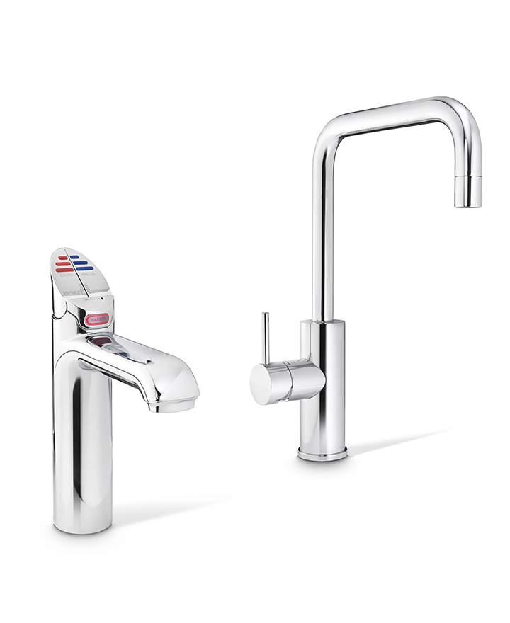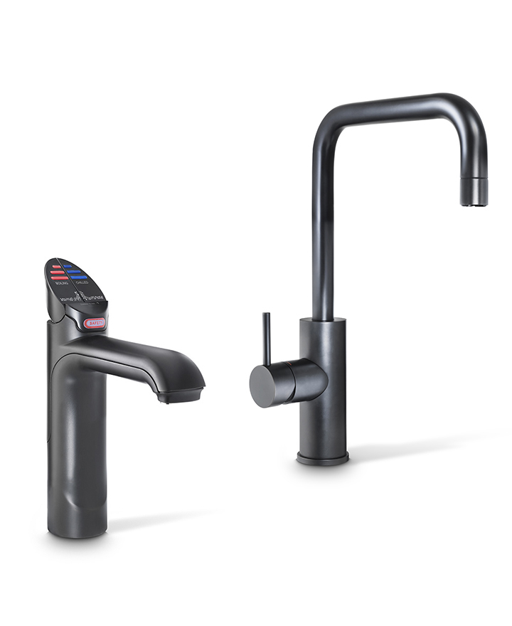 Zenith HydroTap Classic 5 in 1 Boiling, Chilled, Sparkling, Filtered water plus Hot and Cold washing up water from two separate taps. The system features a single under bench command centre including full colour interactive touch screen display with pin code protection and customisable settings including 2 boiling water safety modes, 3 energy saving modes including ON/OFF timers and sensor activated 'sleep when it's dark', 'Quiet' mode with automated intelligent fan speed adjustment, antimicrobial protection impregnated into key water paths for enhanced hygiene, 100% water efficient air cooled technology, and 0.2 micron water filtration. Easy to install integrated ventilation tray included.